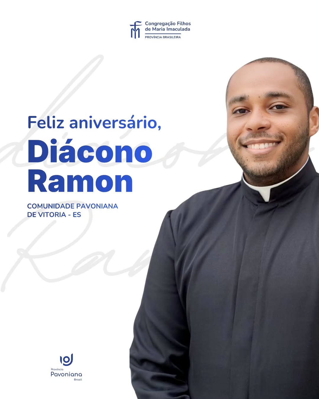 Hoje (30) celebramos com alegria o dom da vida do diác. Ramon Santos, membro da comunidade pavoniana de Vitória-ES. Que pela intercessão de São Ludovico Pavoni, Deus continue sustentando com os dons do Espírito Santo e, sob o olhar terno de Maria Imaculada, fortaleça sua caminhada vocacional. Rezemos por sua vida!